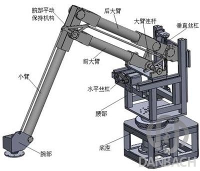 機(jī)器人由4個(gè)主動(dòng)軸與個(gè)機(jī)械手組成,其中主動(dòng)軸電機(jī)由伺服器驅(qū)動(dòng),機(jī)械手由氣動(dòng)夾組成,通過(guò)氣泵驅(qū)動(dòng)。由1個(gè)高速DO控制伺服器的運(yùn)行位置和速度,1個(gè)DO信號(hào)控制電機(jī)運(yùn)行方向,1個(gè)DI信號(hào)指示每個(gè)軸的原點(diǎn),4個(gè)DI信號(hào)連接正負(fù)限位開關(guān)與正負(fù)限限位開關(guān),使用2個(gè)DI和1個(gè)DO控制氣動(dòng)夾壓力,由2個(gè)DI采集來(lái)貨信號(hào)。系統(tǒng)共需要4個(gè)高速DO、6個(gè)DO、22個(gè)DI。采用1個(gè)PAC可編程運(yùn)動(dòng)控制器iTC1012與2個(gè)擴(kuò)展模塊DEM3000組成控制系統(tǒng),在iTC1012上運(yùn)行實(shí)時(shí)內(nèi)核和軟PLC、軟NC程序,通過(guò)D-BUS進(jìn)行數(shù)據(jù)通信實(shí)現(xiàn)I/O變量刷新,通過(guò)DEM3000的高速脈沖輸出和輸入輸出能力實(shí)現(xiàn)機(jī)器人的網(wǎng)絡(luò)化控制。使用PLC_Config編程軟件開發(fā)機(jī)器人控制程序,實(shí)現(xiàn)了多軸高速同步、搬運(yùn)軌跡抖動(dòng)抑制、高精度定位等功能。操作界面采用DView組態(tài)軟件編寫,實(shí)現(xiàn)軌跡示教、參數(shù)設(shè)定、三維仿真等功能。